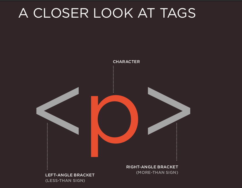 - The HTML code (in blue) is made up of characters that live inside angled brackets — these are called HTML elements. Elements are usually made up of two tags: an opening tag and a closing tag. (The closing tag has an extra forward slash in it.) Each HTML element tells the browser something about the information that sits between its opening and closing tags.